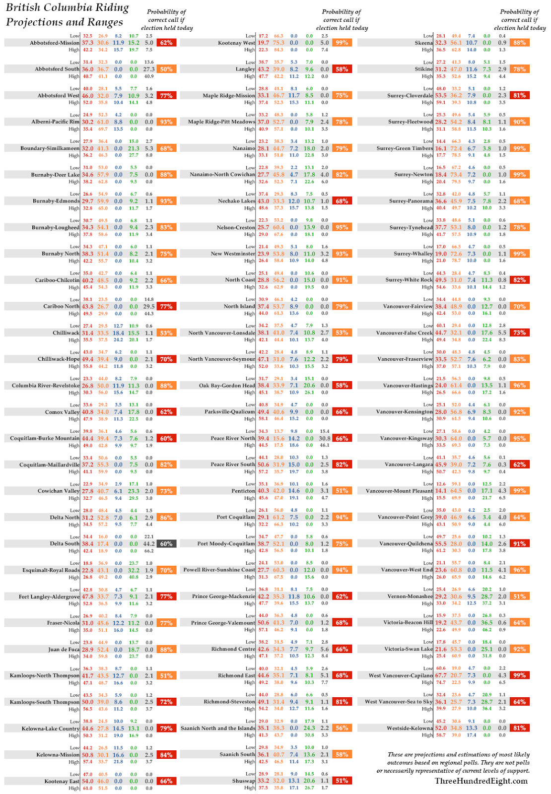 Of the Vancouver ridings, the BC NDP is projected to pick up all but two of the eleven seats up for grabs on election day, with the Liberals registering wins in only Vancouver-Quilchena and Vancouver-Langara. And even at that, contact from senior members of the Vancouver-Langara campaign teams over the weekend, from both main parties, suggest a win for the BC NDP in Vancouver-Langara is quite possible, as the race is close — regardless of 308.com’s imprecations on the matter to the contrary, which would mean a win of 10 of the 11 seats in Vancouver going to the BC NDP.